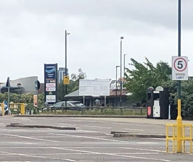 On a recent site visit with the developer, Peabody, I was shown the very spot (big white sign in blurry photo below) where a Thamesmead DLR station would go, right next to an unexceptional drive-to shopping centre served by a large car park a mere spit from the Thames.