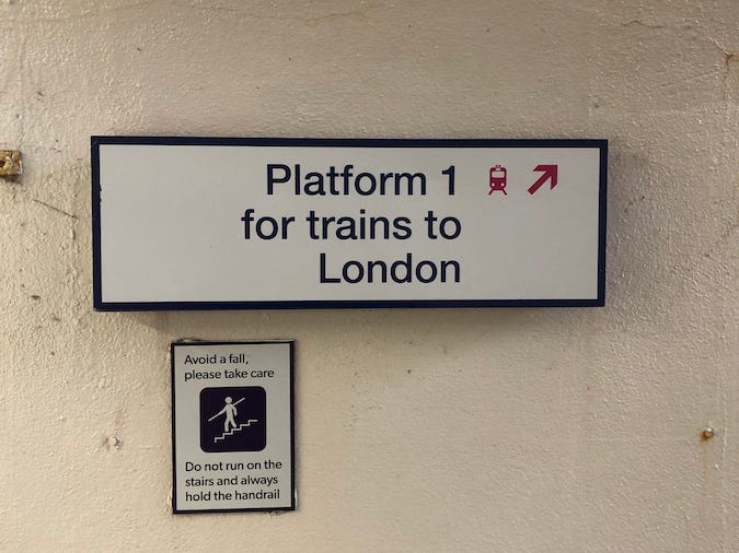 Crews Hill is right at the northern edge of Enfield and, therefore, of Greater London. The next stop on the line to Stevenage, a flagship post-war New Town, is Cuffley, a village in Hertfordshire. A sign within the station directs passengers to trains to London, perhaps suggesting that the area itself might not see itself as part of the capital.